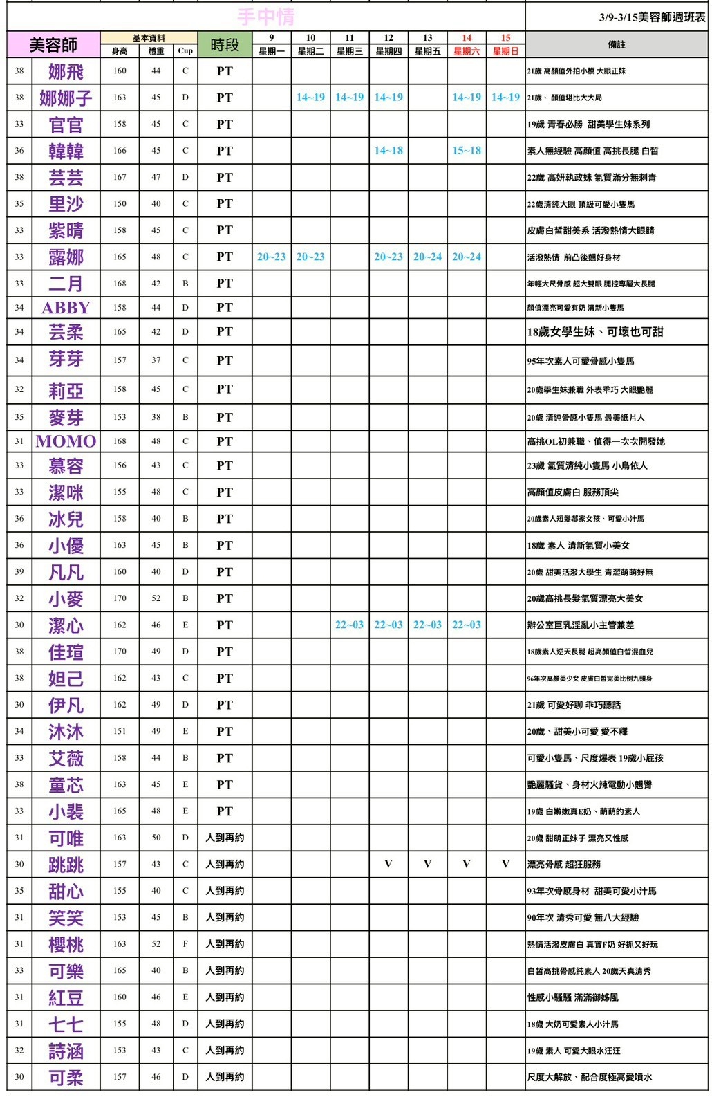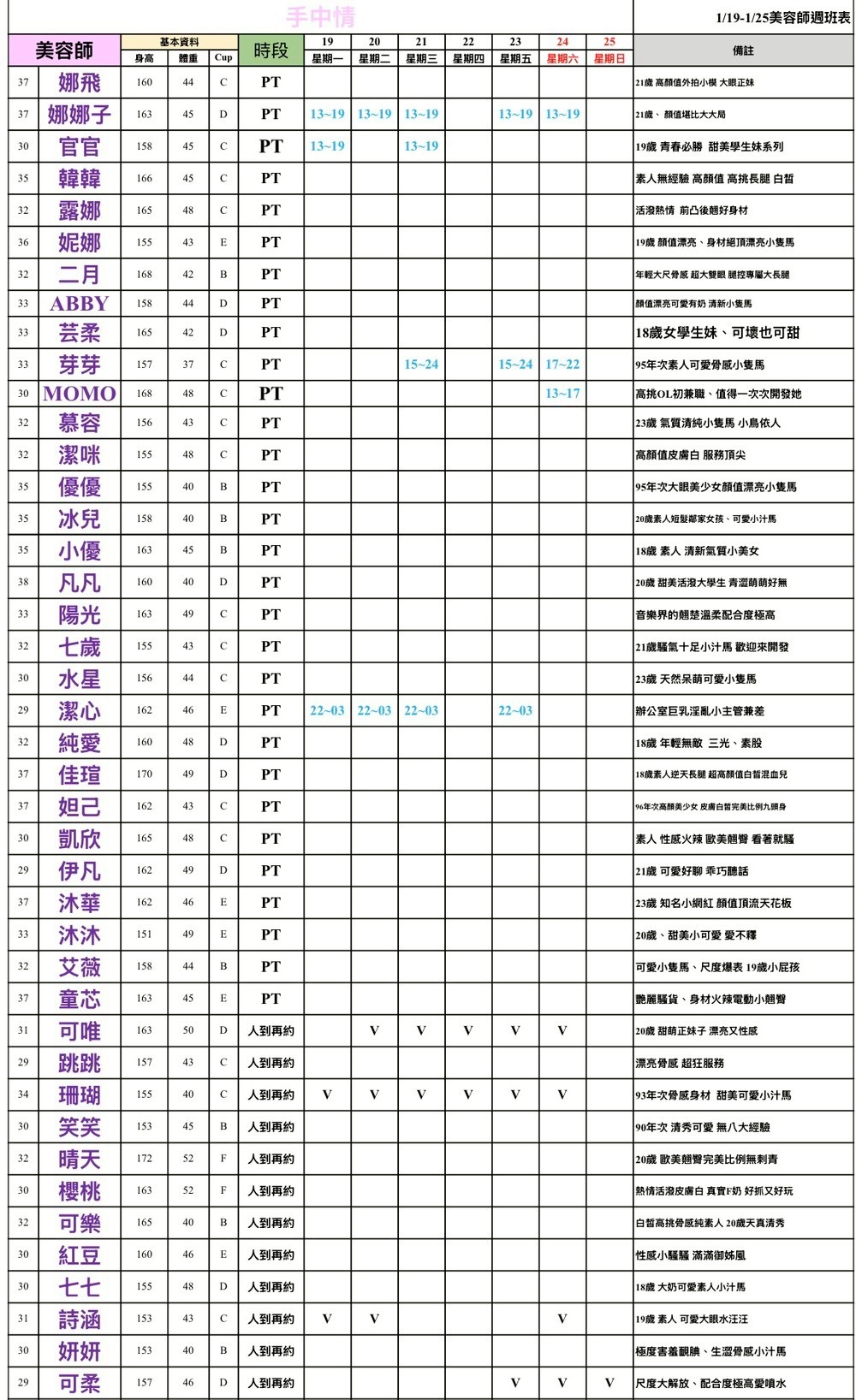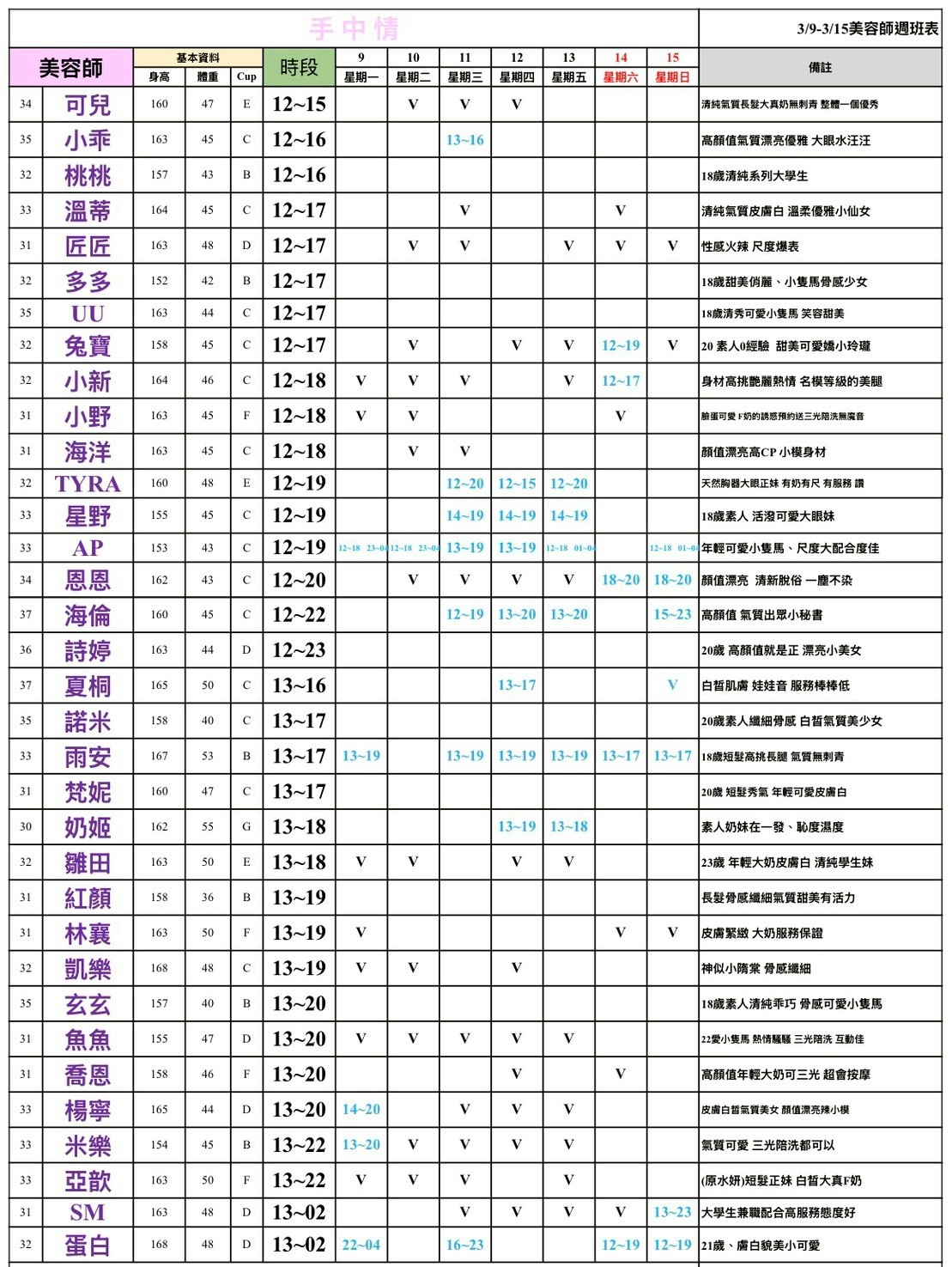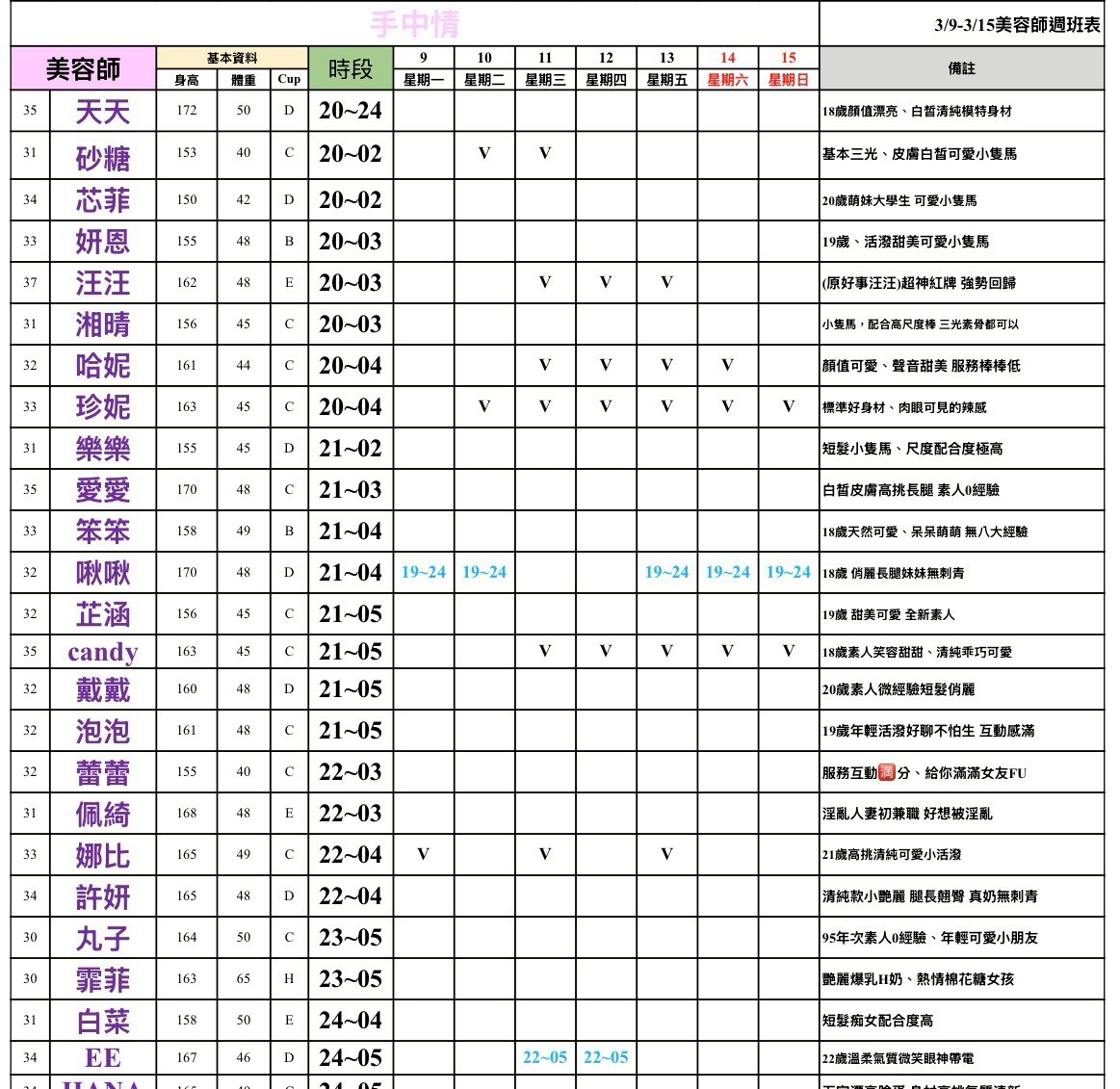 - 有打 V 為報班、時段代表當日的上班時段(不一定有空班)